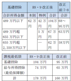 基礎控除は、本則部分を62 万円、令和7年度改正で新たに設けた特例部分は合計所得金額489万円以下で42万円に引き上げ、本則部分とあわせて104万円とします。